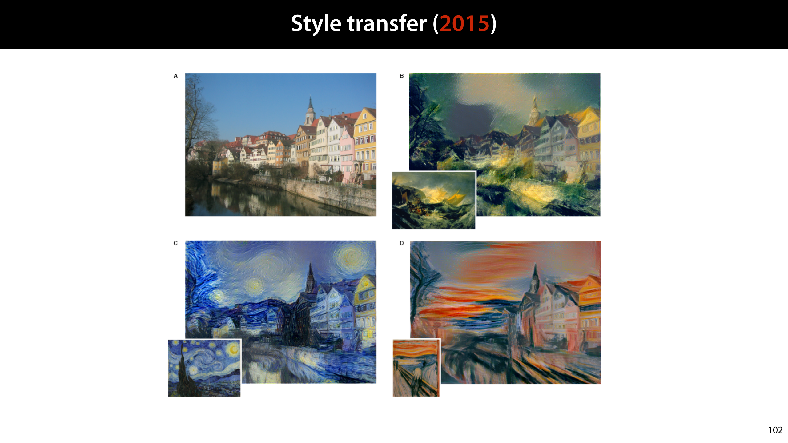 This example uses a convolutional network to transfer the style of one image onto another. Interestingly, this work was done with a general purpose network, trained on a general classification task (such networks are available for download). The authors took this network, and didn’t change the weights. They just built the style transfer architecture around the existing network.