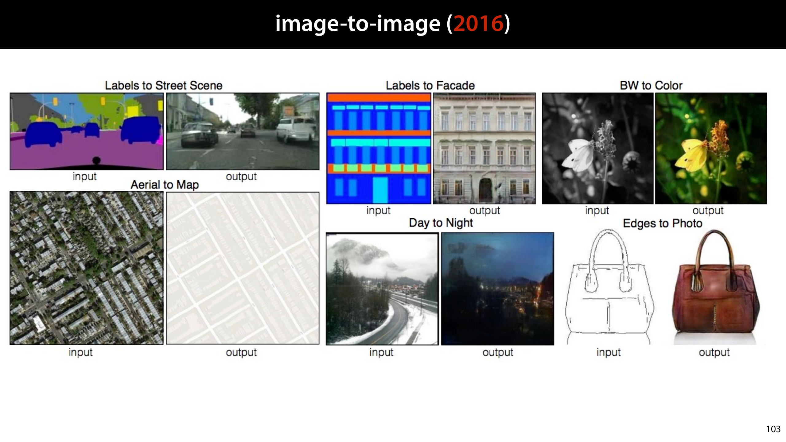 This is pix2pix: a network with images as inputs and images as outputs was trained on various example datasets. Note the direction of the transformation. For instance, in the top left, the street scene with labeled objects was the input. The car-like objects, road surface, tree etc were all generated by the neural network to fill in the coloured patches in the input. Similarly, the bottom right shows the network generating a picture of a handbag from a line-drawing.