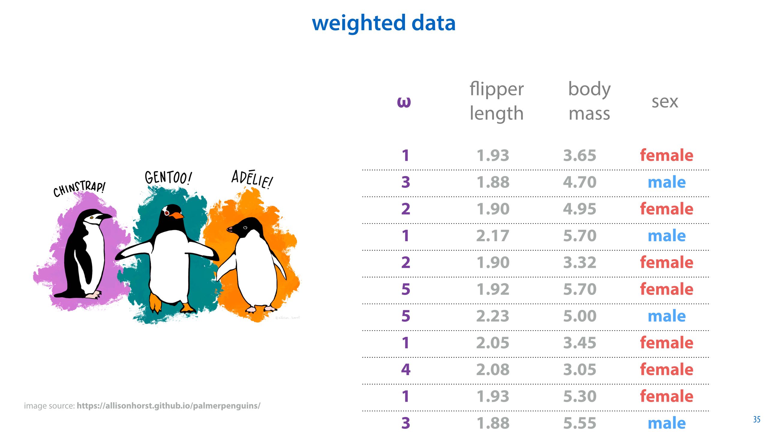 For instance, in this example, we could imagine that some penguins struggled more than other as we were trying to measure them, and so we estimate how accurate we think the measurement is with a grade between 0 and 5.