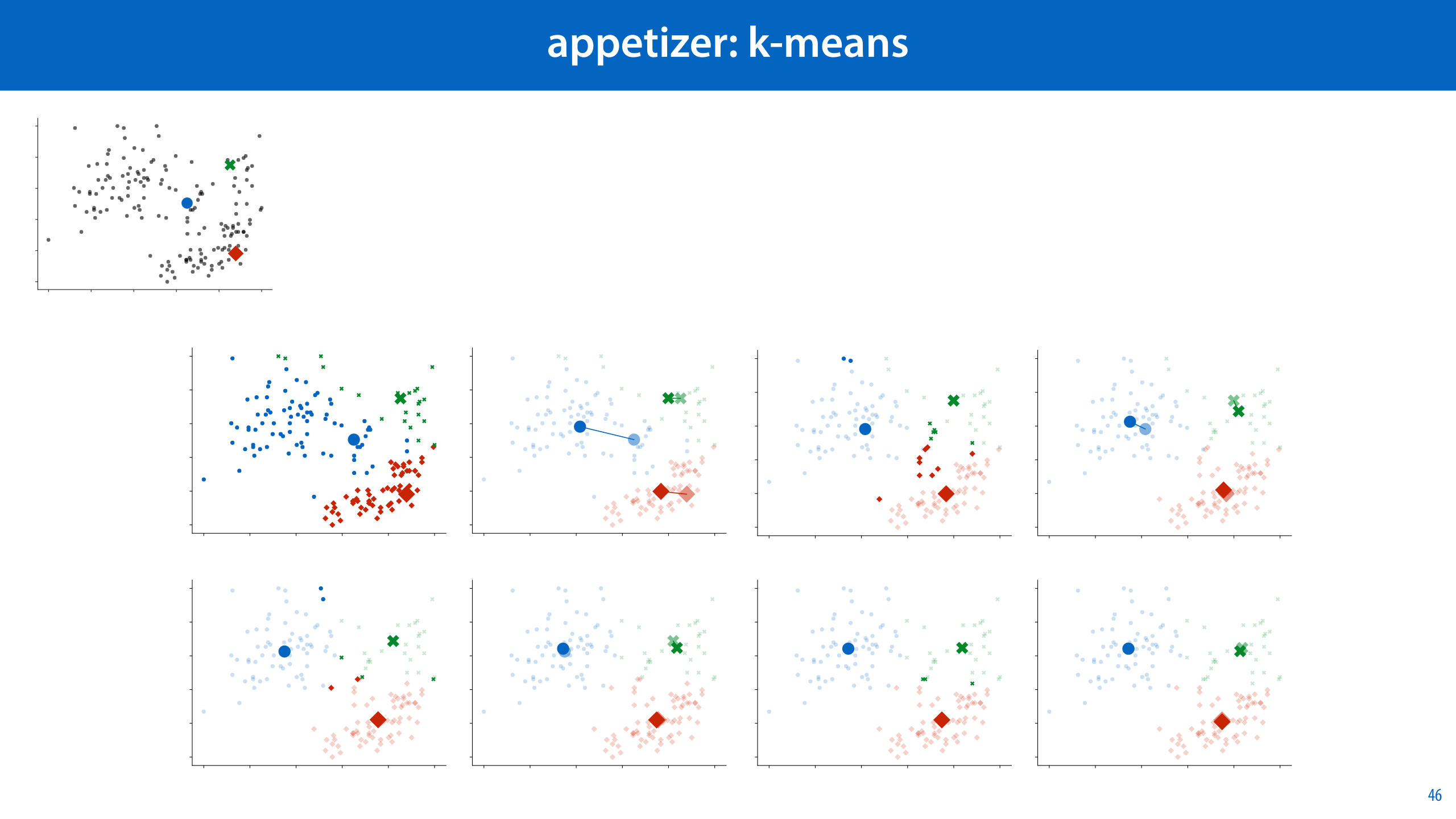 Since we know neither, we set one of them (the cluster centers) to an arbitrary value, and then assign the points to the obvious clusters. Then we fix the cluster memberships and recompute the cluster centers. If we repeat this process, we end up converging to a good solution.
