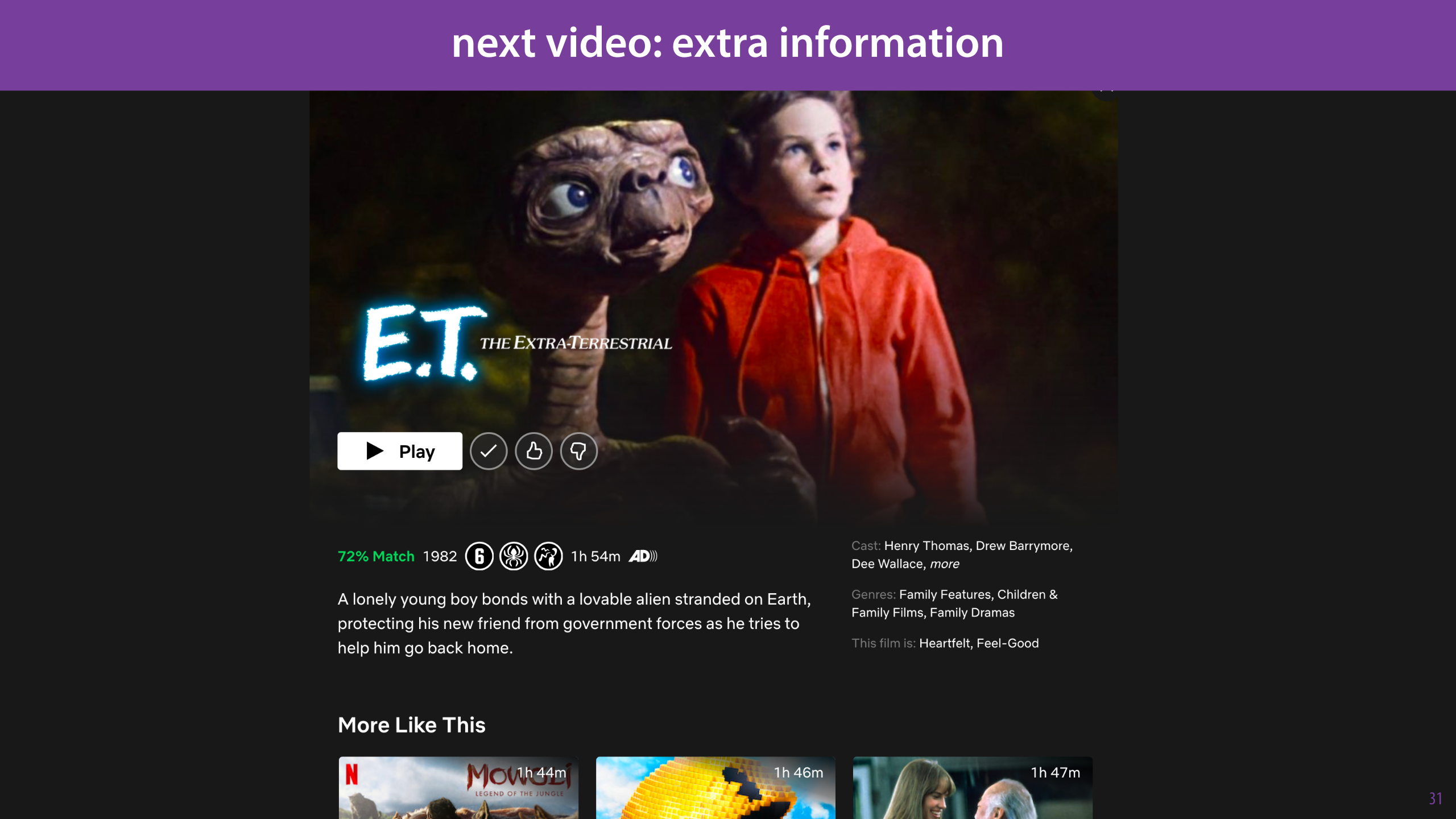 So far, we’ve assumed that we don’t have any information about users and movies by themselves: only the links between them. In practice, this isn’t true at all: Netflix has lots of extra information about both the users and the movies in its database. It’s just that we’ve assumed that the ratings are the most informative, so that we should start there.