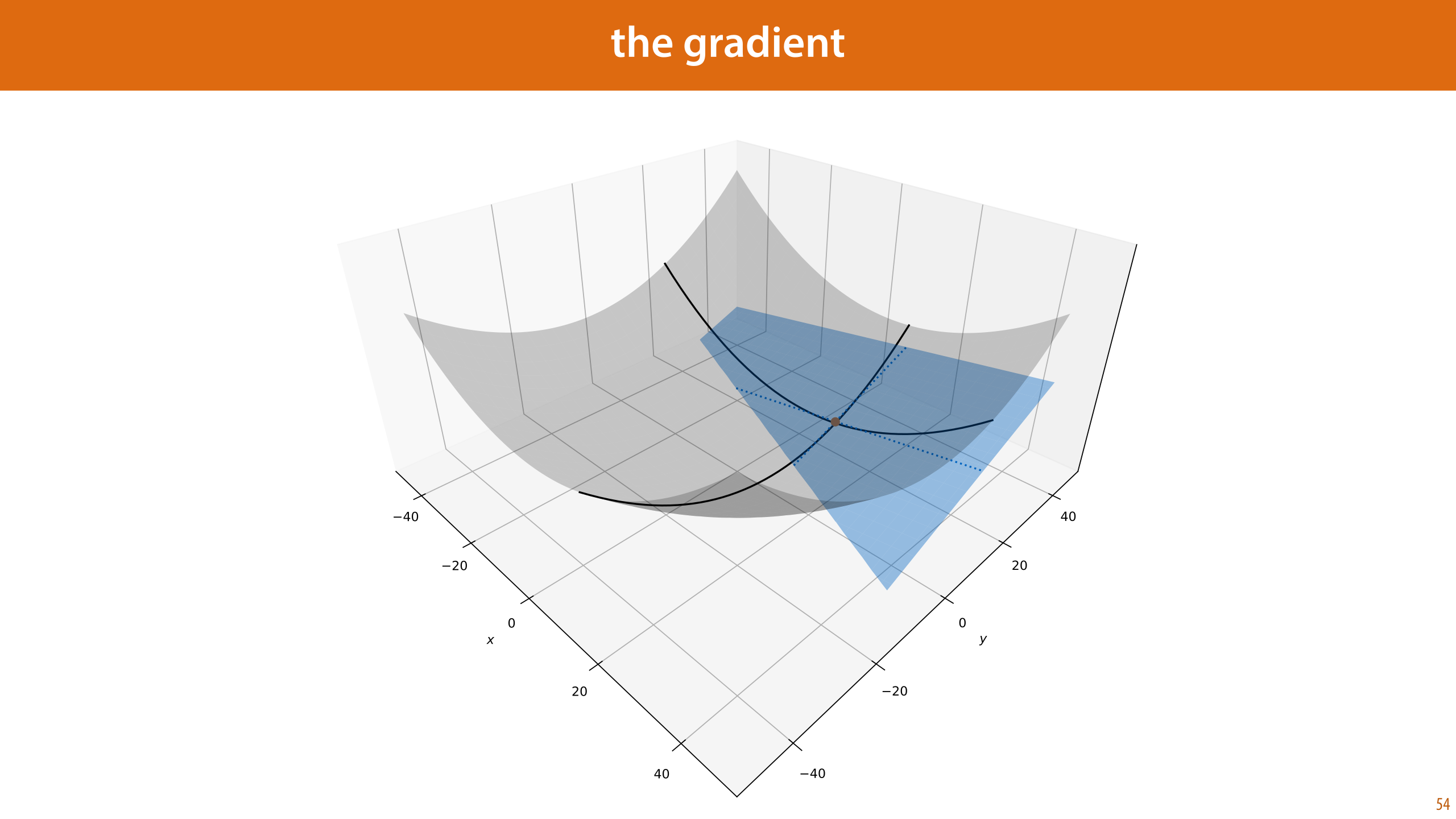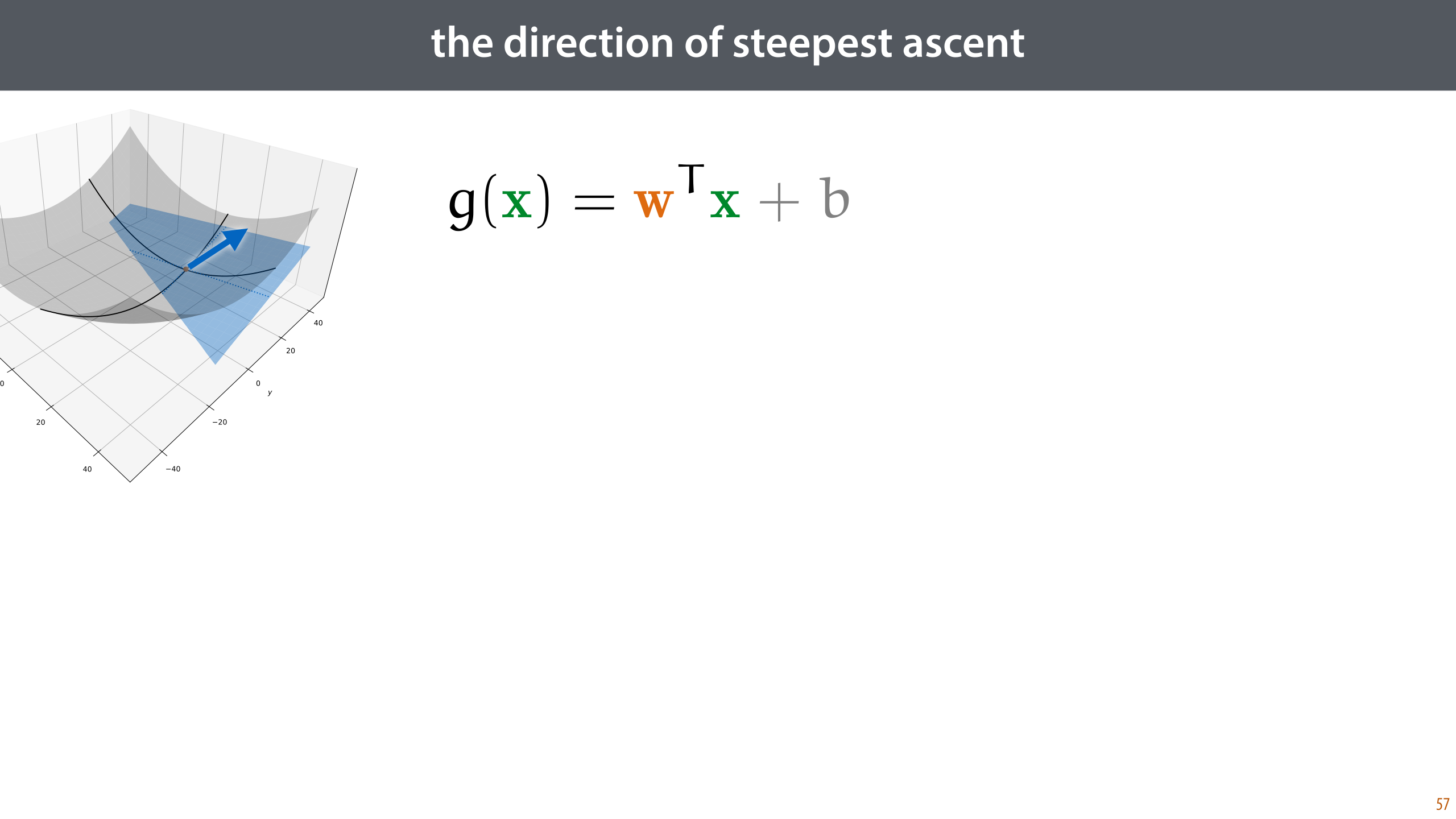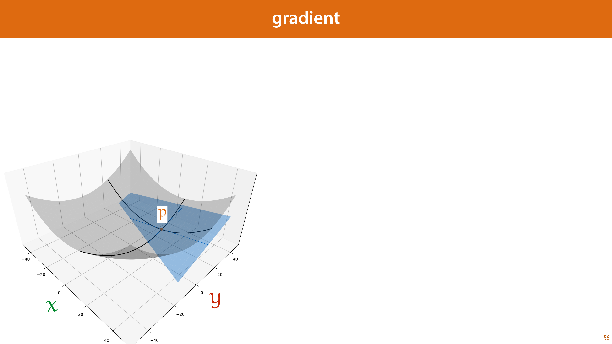 One thing that is sometimes a little confusing is that the gradient of a function f(·) is often written as another function ∇f(·). This ∇f(·) tells us not what the gradient is at a specific point but for all points. This is the same with the derivative: at a particular point, the derivative is some numerical value, but over all points, the derivative of f(x) is another function f’(x). If we take the gradient to be a function like this, then the tangent hyperplane of f(x) at point p is the function g(x) = ∇f(p)Tx + c.